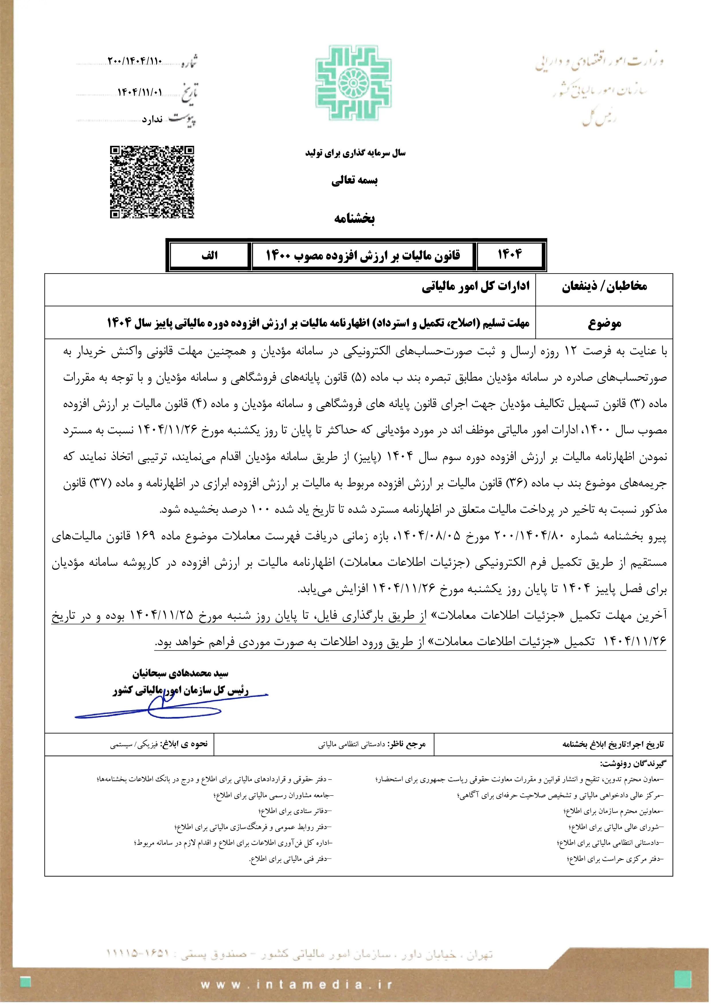 مهلت نهایی ارسال اظهارنامه ارزش افزوده پاییز تا یکشنبه ۲۶ بهمن ۱۴۰۴ تمدید شد. اگر تا این تاریخ اظهارنامه را بفرستید یا اصلاح کنید، تمام جریمه‌های تاخیر شما ۱۰۰٪ بخشیده می‌شود. همچنین مهلت ارسال لیست معاملات فصلی (آن دسته از معاملاتی که به صورت درایه های خارج از سامانه مستقیما در اظهارنامه پیش فرض ارزش افزوده ثبت خواهند شد ) نیز تا همین تاریخ تمدید شده است.