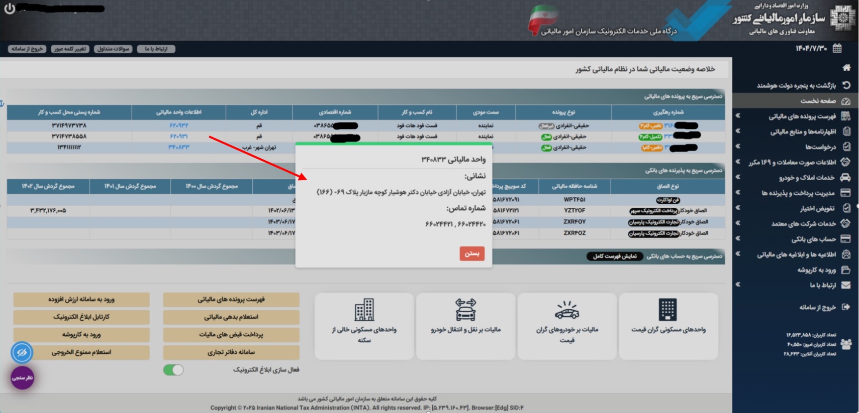 روی عدد منحصر به فرد آبی رنگ کلیک کنید، یک پنجره کوچک روی صفحه باز می شود که نشان دهنده ی آدرس دقیق پرونده و شماره تماس ادراره مالیاتی مربوطه می باشد.