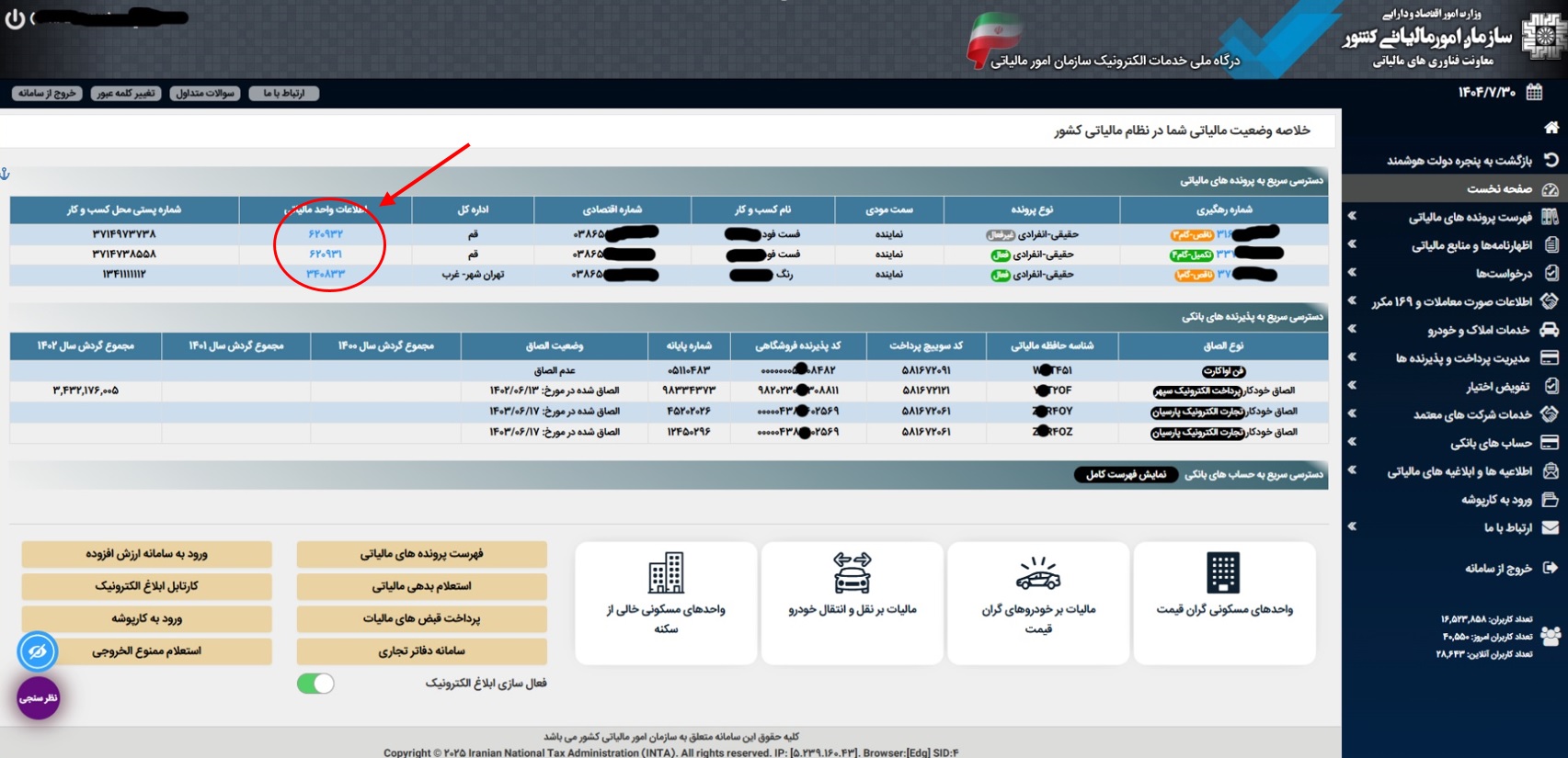 آسان تر از دو روش قبل، پیدا کردن محل پرونده به روش آنلاین است. به این صورت که وارد سامانه ملی مالیات شده و در همان صفحه نخست مطابق تصویر، از قسمت دسترسی سریع به پرونده های مالیاتی، اطلاعات واحد مالیاتی پرونده قابل مشاهده می باشد.